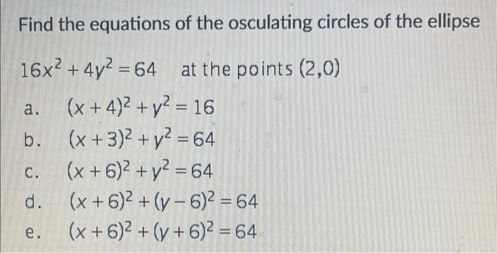 How To Find The Equations Of The Osculating Circles Of The Ellipse 16x 2 4y 2 64 At The Points 2 0 And 0 4 Quora